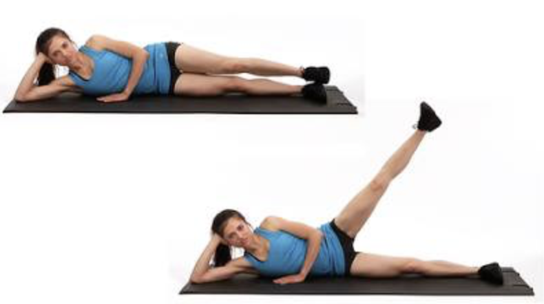 ท่านี้ทำได้ทั้งท่านอนและท่ายืน ถ้าเป็นท่านอน ก็นอนตะแคงขวา ศีรษะจะวางบนแขนหรือจะเอาแขนขึ้นมาท้าวศีรษะก็ตามความถนัด ขาซ้ายบางขนานไปบนขาขวา จากนั้นค่อยๆ ยกขาซ้ายขึ้นช้าๆ ให้ได้มากที่สุดเท่าที่ทำได้ จากนั้นค่อยๆ ลดขาที่ยก กลับไปตำแหน่งเดิม ทำ 15-20 ครั้ง แล้วเปลี่ยนท่านอนเป็นตะแคงซ้าย แล้วยกด้วยขาขวา ทำจำนวนเท่ากัน ครบแล้วนับเป็น 1 เซ็ต พักระหว่างเซ็ตประมาณ 30 วินาที ถึง 1 นาที สามารถ เพิ่ม แรงต้านโดยใช้ elastic band ผูกเท้าทั้งสอง