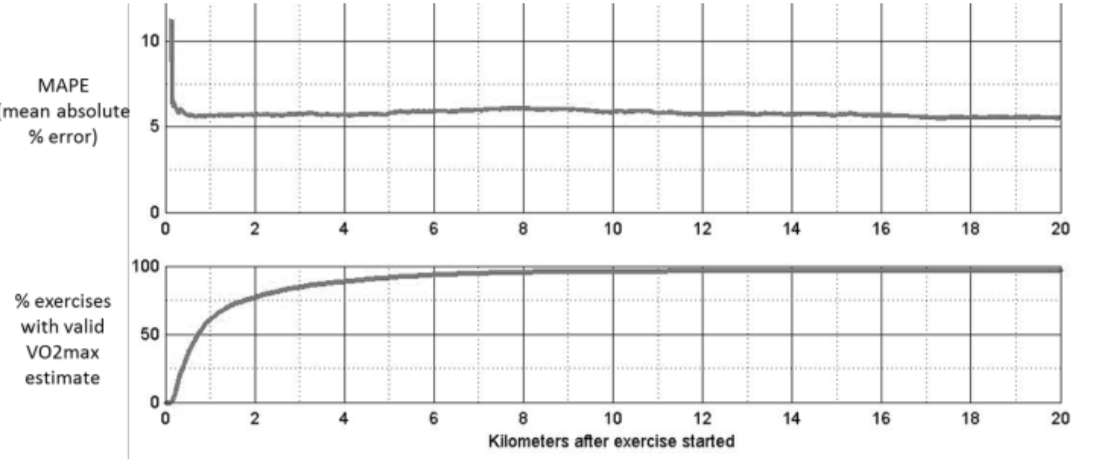 ดังที่แสดงในรูปที่ 4 ข้อผิดพลาดในการประมาณอยู่ใกล้กับ 5% ในการทำงานแล้วโดยมีช่วงเวลาสั้น ๆ ของข้อมูลและใน 75% ของการออกกำลังกาย VO2max ได้รับการประเมินเรียบร้อยแล้วหลังจากใช้งาน 2 กิโลเมตร วิธีการดังกล่าวได้รับการตรวจสอบด้วยการขี่จักรยานที่ดำเนินการอย่างอิสระโดยนักปั่นจักรยาน 29 คนซึ่งมีอัตราการใช้ถีบและอัตราการเต้นหัวใจ ความแม่นยำของวิธีการเมื่อใช้กับการปั่นจักรยานคือ 92% (MAPE ~ 5%) นอกจากนี้ข้อมูลจาก 42 ที่ดำเนินการอย่างอิสระเดิน 32 คนที่มีระดับการออกกำลังกายที่หลากหลายได้รับการเก็บรวบรวมและเปรียบเทียบกับข้อมูลการทดสอบในห้องปฏิบัติการโดยตรง ผลการวิจัยพบว่าเมื่อนำไปใช้ในการเดิน MAPE คือ ~ 6%