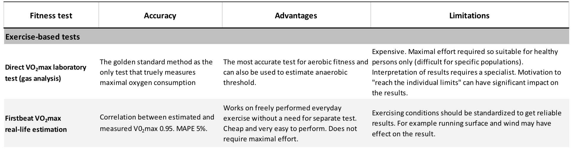 Firstbeat VO2max ได้รับการพัฒนาเทียบกับค่า VO2max ที่วัดในห้องปฏิบัติการ (รูปที่ 3) และผ่านการตรวจสอบด้วยโหมดการออกกำลังกายที่แตกต่างกัน ความแม่นยำของวิธีการที่ใช้สำหรับการทำงานคือ 95% (ค่าเฉลี่ยเปอร์เซ็นต์ข้อผิดพลาด MAPE ~ 5%) ขึ้นอยู่กับฐานข้อมูลของ 2690 ที่ดำเนินการได้อย่างอิสระวิ่งจาก 79 นักวิ่งที่มีการทดสอบ VO2max สี่ครั้งระหว่างการเตรียม 6-9 -month ระยะเวลาสำหรับการวิ่งมาราธอน ในการวัดส่วนใหญ่ข้อผิดพลาดต่ำกว่า 3.5 มล. / กก. / นาทีและข้อผิดพลาดกระจายอย่างสม่ำเสมอทั่วค่าเฉลี่ย สำหรับมุมมองข้อผิดพลาดในการทดสอบ submaximal ทางอ้อมโดยทั่วไปคือ 10-15% และในการทดสอบในห้องปฏิบัติการโดยตรงประมาณ 5%