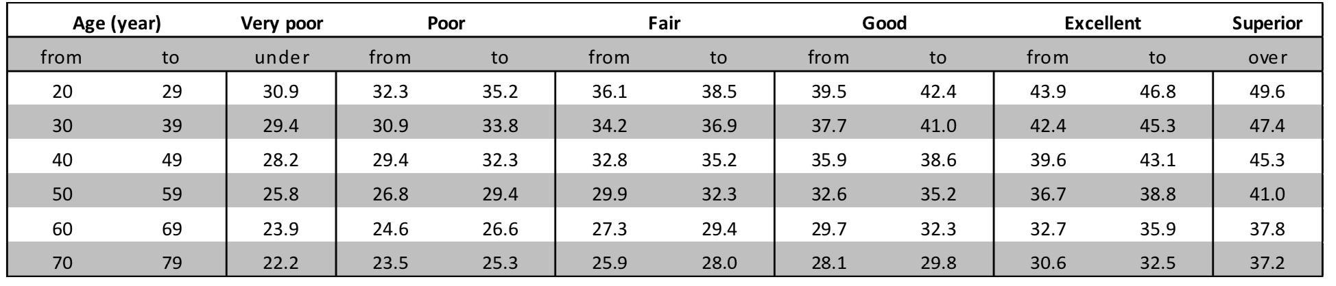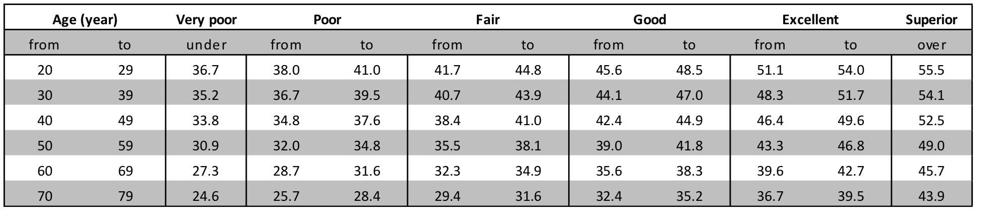 Fitness level (VO2max) classification for men ตารางค่าความฟิต จากค่า VO2 Max ของ ผู้ชายแบ่งตามช่วงอายุ