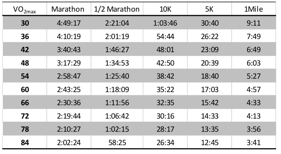 ไม่ว่าในกรณีใดการคาดการณ์เวลาการแข่งขันจะให้ข้อเสนอแนะที่น่าสนใจและเป็นรูปธรรมเกี่ยวกับระดับความฟิตปัจจุบันและการประเมินความสามารถที่คาดหวังในการแข่งขัน ดูตัวอย่างการทำนายเวลาการแข่งขัน จากค่า VO2 Max ของแจ็คแดเนียลส์ ด้านล่างนี้