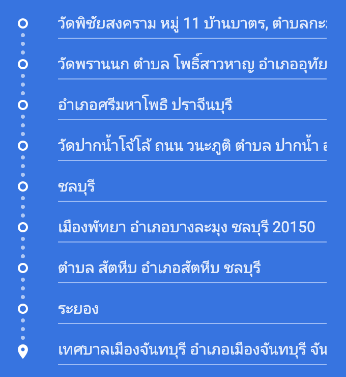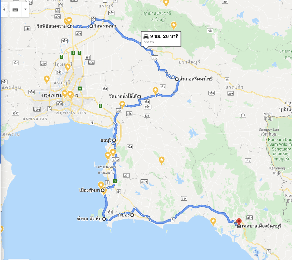 กรุงศรีอยุธยา วัดพิชัย – บ้านหารตรา บ้านโพธิ์สังหาร (อ.อุทัย) บ้านพรานนก บ้านบางดง หนองไม้ทรง เมืองนครนายก ด่านกบแจะ (อ.ประจันตคาม) ศรีมหาโพธิ วกมาทาง ปากน้ำโจ้โล (อ.บางคล้า) ต่อไปที่ บางปลาสร้อย นาเลฃกลือ พัทยา นาจอมเทียน ไก่เตี้ย สัตหีบ เมืองระยอง แกลง จันทบุรี เลยไปถึง บ้านทุ่งใหญ่ (ตราด)