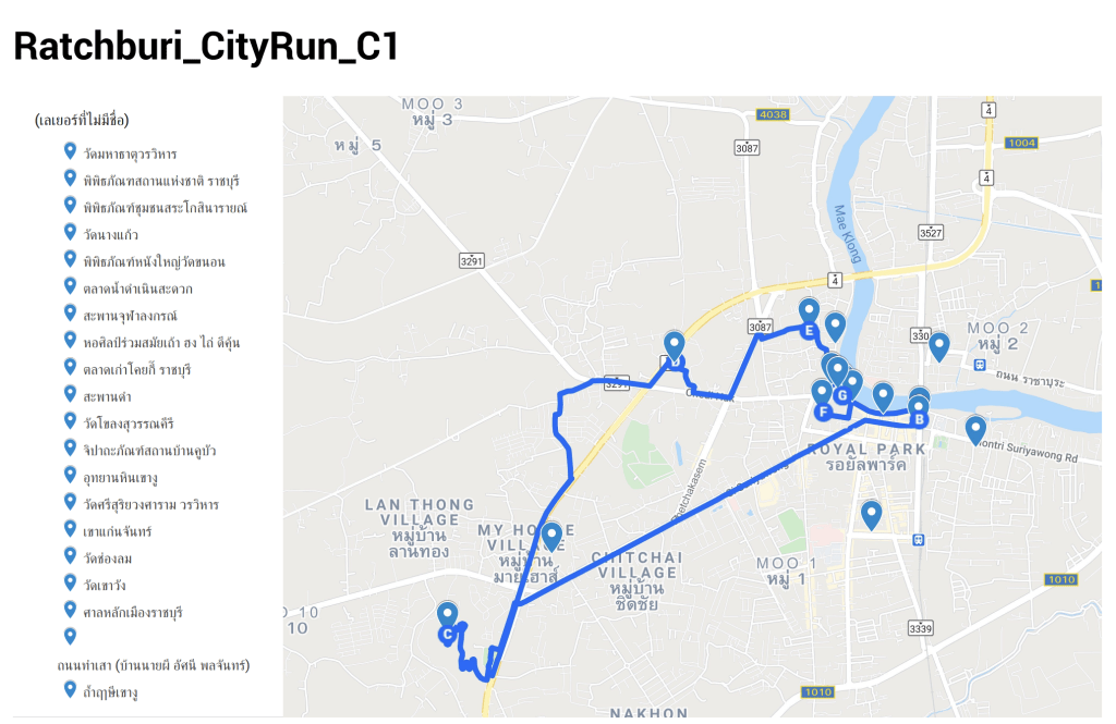 เริ่มต้นวิ่งจากริมแม่น้ำแม่กลอง หน้าพิพิธภัณฑสถานแห่งชาติ ราชบุรี เพื่อไปเที่ยวยังสถานที่ดังนี้
