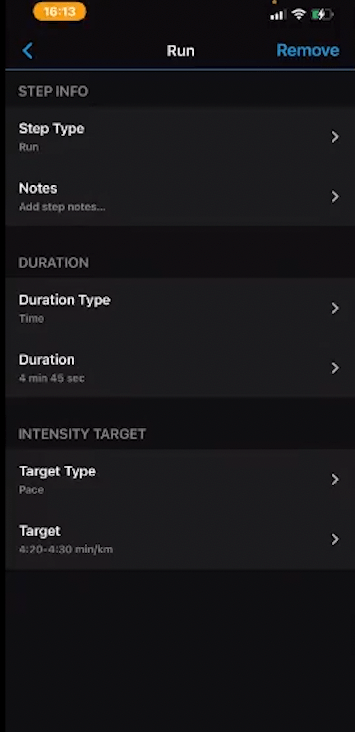 8) ตัวอย่างการ ใส่ step ช่วงวิ่งให้ วิ่งเพซ ช่วง 4:20-4:30 นาน 4:45 นาที