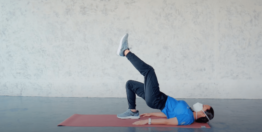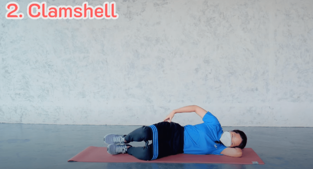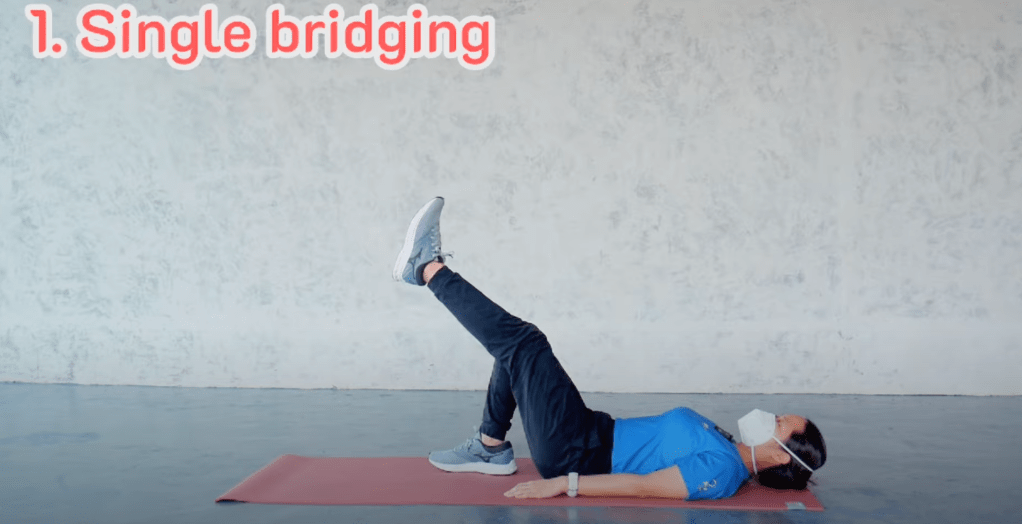 นอนราบให้แม่วท้องให้หลังติดพื้น ยกขาขึ่นหนึ่งข้าง เกร็งก้น ยกสะโพกลอยขึ้น ให้สูงที่สุด ทำสิบครั้ง 2 set ต่อข้าง