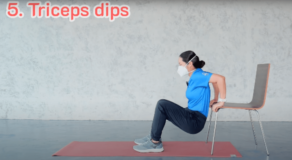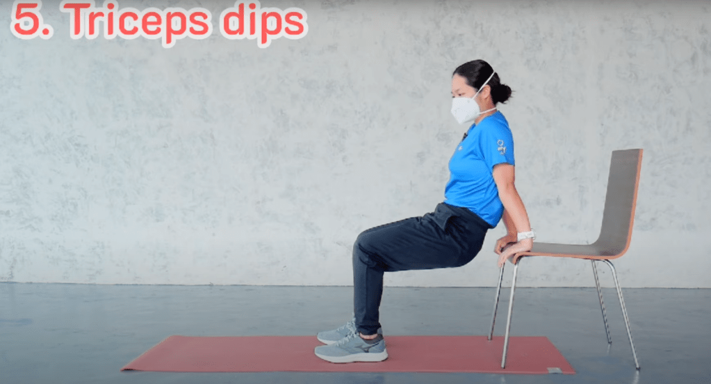 นั่งบนเก้าอี้ โดยเลื่อนตัวไปด้านหน้าเอามือจับขอบเก้าอี้ไว้ ให้เข่าตั้งฉากกับข้อเท้า ค่อยๆย่อตัวลง และดันตัวขึ้น แรงจะอยู่ที่ต้นแขน ตอนดันขึ้น พยายามดึงศอกไปด้านหลัง ทำ 7-10 ครั้ง 2 set