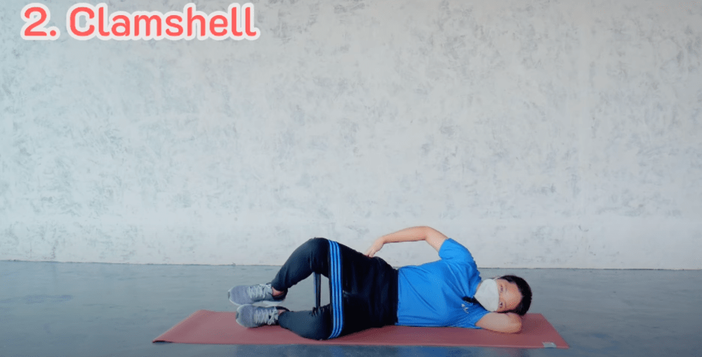 นอนตะแคง แขม่วท้อง หมุนเข่ายกขึ้น 10-15 ครั้ง โดยไม่ต้องยกเท้าขึ้น เพิ่มยางเพื่อเพิ่มแรงต้าน ทำ 10-15 ครั้ง สอง set ต่อข้าง