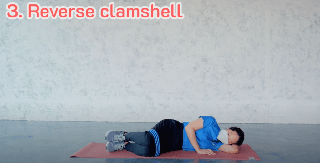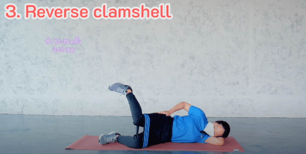 นอนตะแคงท่าเริ่มต้นเดียวกับ Cramshell ท่าที่สอง ยกขาและเท้ากางขึ้น โดยให้เข่าเป็นแนวตรงกับสะโพกเป็นจุดหมุน หมุนขาบิดขึ้นไปแนวตรง ทำ 10-15 ครั้ง สอง set ต่อข้าง