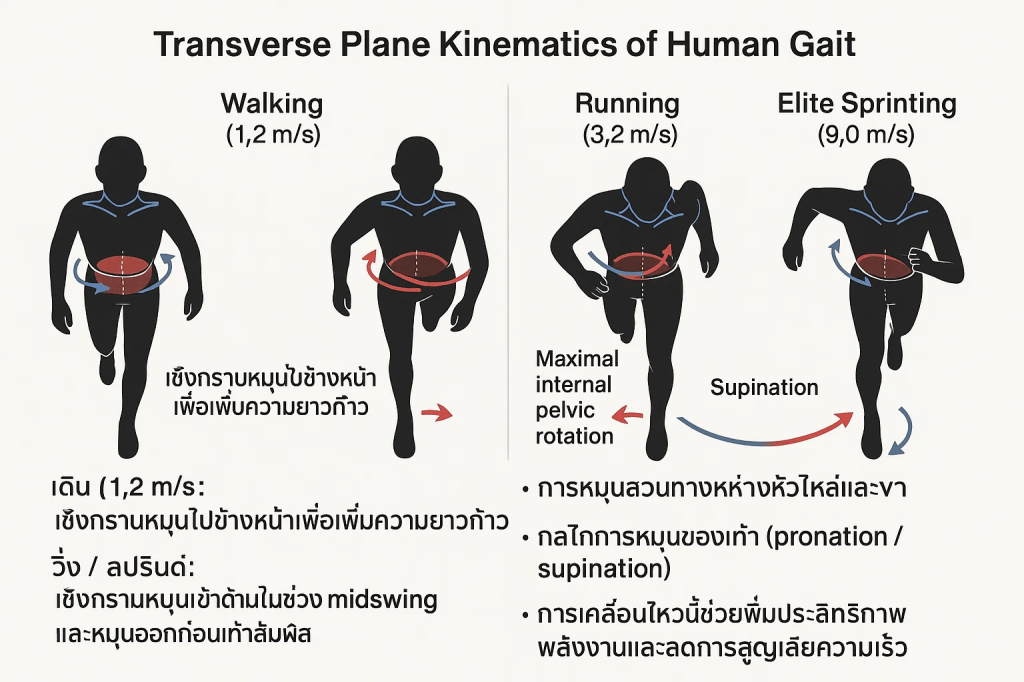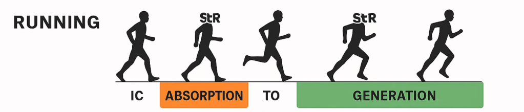 - Generation (สร้างพลังงาน): ตั้งแต่ StR → TO → SwR ร่างกายผลักตัวเพื่อสร้างแรงขับเคลื่อนไปข้างหน้า