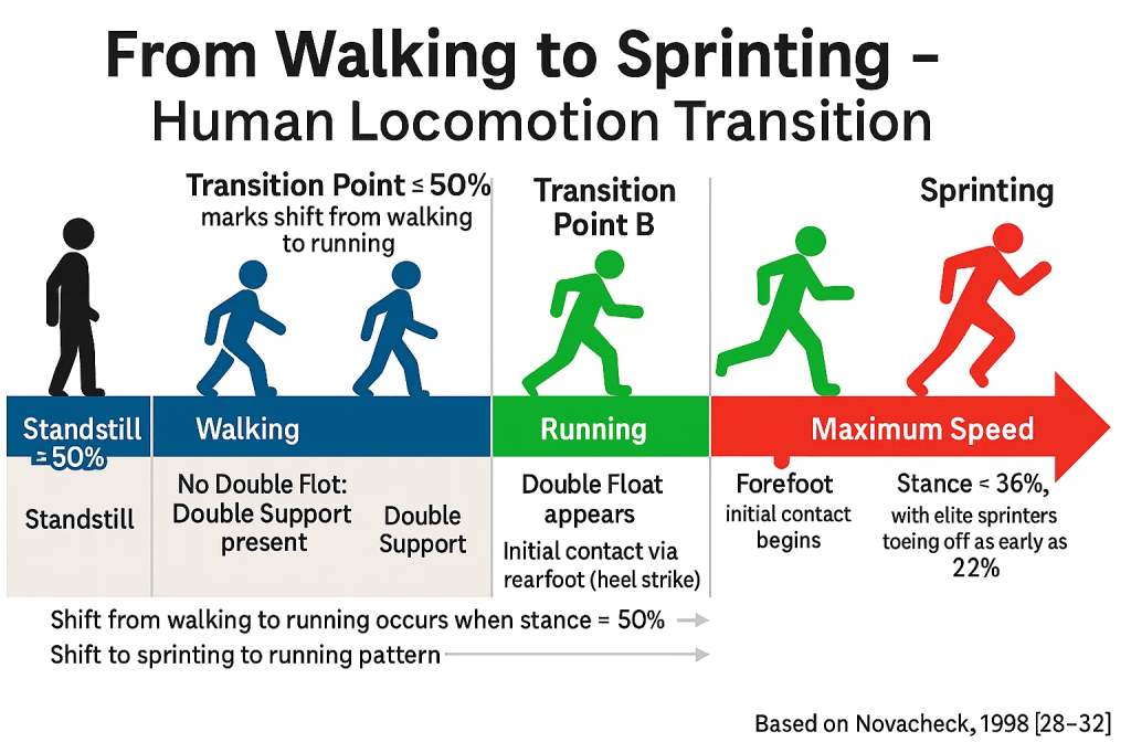 อินโฟกราฟิกนี้แสดงการเปลี่ยนแปลงของวัฏจักรการก้าว (gait cycle) ตั้งแต่การเดิน → การวิ่ง → การสปรินต์ โดยมีจุดเปลี่ยนสำคัญ 2 จุด: