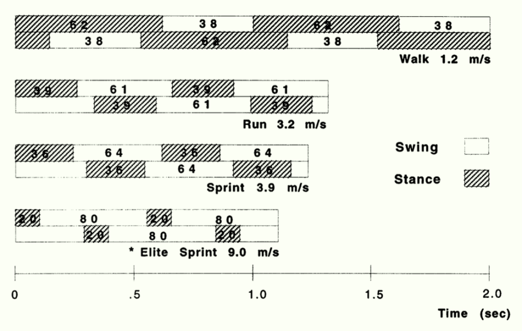 แผนภาพแท่งแนวนอนนี้แสดงรอบการก้าว (gait cycle) สองรอบที่เริ่มต้นจากช่วงที่เท้าแตะพื้น (Initial Contact – IC) สำหรับแต่ละเงื่อนไขของการเดิน วิ่ง และวิ่งเร็ว (sprinting) โดยแบ่งเป็นสองเฟสหลัก ได้แก่เฟสเหยียบพื้น (Stance Phase – พื้นที่แรเงา) และเฟสเหวี่ยงขา (Swing Phase – พื้นที่ขาว)