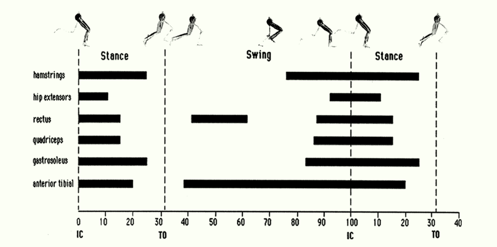 - Stance Phase – Absorption: ช่วงรับแรงกระแทกเมื่อเท้าสัมผัสพื้น กล้ามเนื้อทำงานแบบยืดต้าน (eccentric) เพื่อชะลอแรง