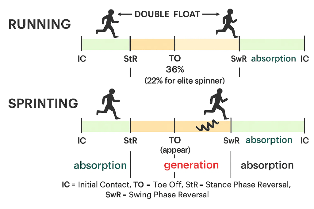 แม้การวิ่งและการสปรินต์จะมีเฟสเหมือนกัน แต่สัดส่วนเวลาและความเข้มข้นของแรงในแต่ละช่วงแตกต่างกันชัดเจน