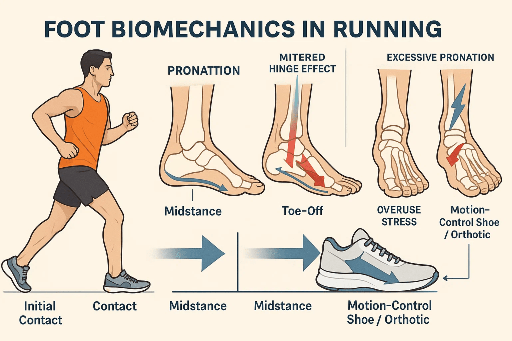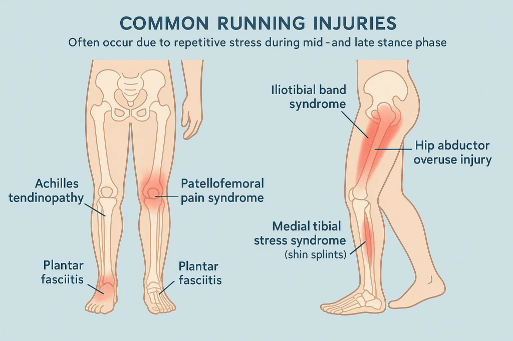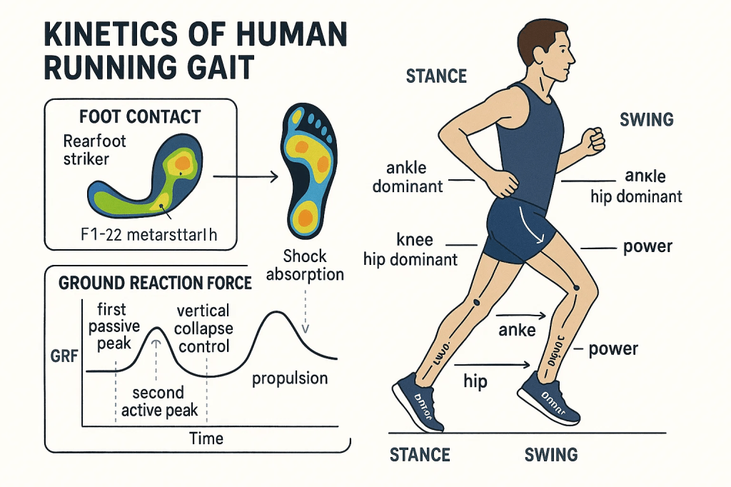 ภาพนี้แสดงลำดับของการเคลื่อนไหวขณะวิ่ง โดยเน้นเฟสสำคัญ 2 ช่วงใน stance phase ได้แก่: