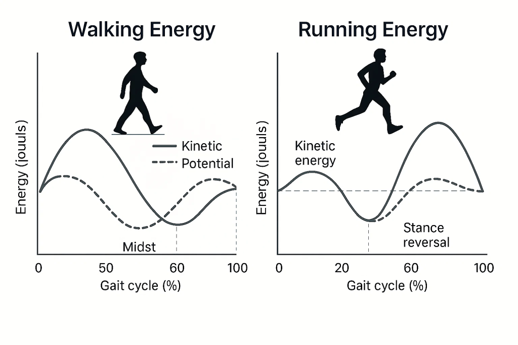 ภาพนี้เน้นให้เห็นถึงลักษณะการใช้พลังงานและจังหวะการเคลื่อนไหวของร่างกายในแต่ละรูปแบบการเคลื่อนที่ พร้อมแสดงสัดส่วนเวลาและจุดเปลี่ยนสำคัญภายในรอบการก้าว