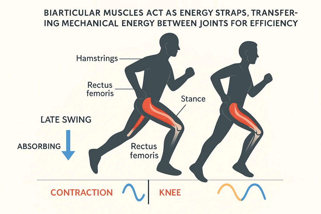 - การทำงานของกล้ามเนื้อหลัก:Quadriceps และ Rectus Femoris: ทำงานตั้งแต่ช่วงปลายระยะเหวี่ยงถึงกลางระยะยืน เพื่อเตรียมแขนขาสำหรับการสัมผัสพื้นและดูดซับแรงกระแทกในช่วงดูดซับของระยะยืน Rectus femoris ซึ่งเป็นกล้ามเนื้อสองข้อต่อ (biarticular muscle) อาจมีบทบาทในการถ่ายโอนพลังงานระหว่างส่วนต่างๆ ของร่างกาย