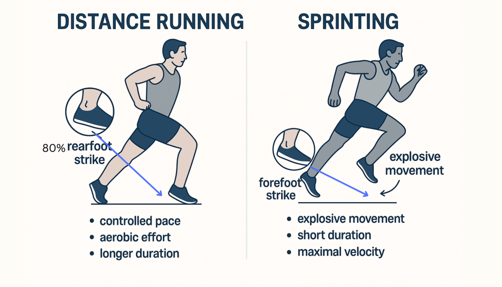 ภาพนี้แสดงให้เห็นความแตกต่างของ รูปแบบการลงเท้า, รูปแบบพลังงานที่ใช้, และ ลักษณะของการเคลื่อนไหว ระหว่างการวิ่งระยะไกลและการสปรินต์