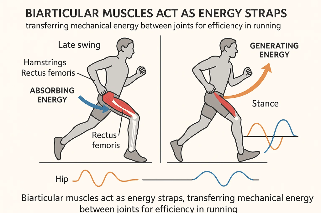 ภาพนี้สะท้อนแนวคิดว่าการวิ่งคือกระบวนการที่ร่างกายใช้กลไกทั้งการดูดซับและการสร้างพลังงานผ่านกล้ามเนื้อ เส้นเอ็น และจังหวะการเคลื่อนไหวอย่างแม่นยำ