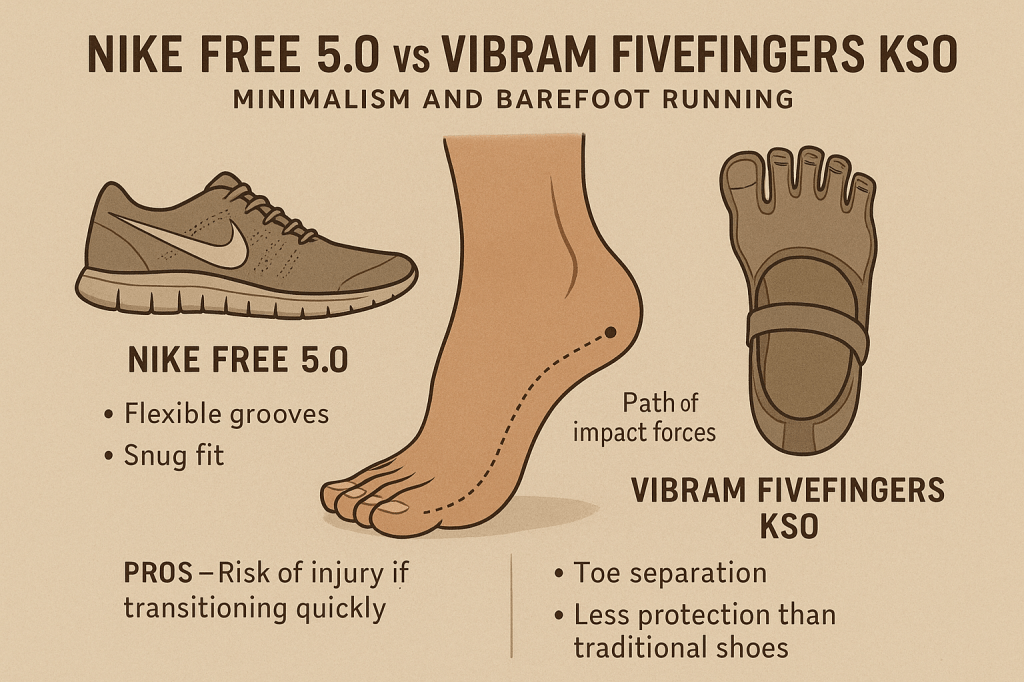 - Vibram FiveFingers KSO (ปี 2005): ช่องแยกนิ้วเท้าแต่ละนิ้ว + พื้นรองเท้าบางพิเศษให้ความรู้สึก “เท้าเปล่า”
