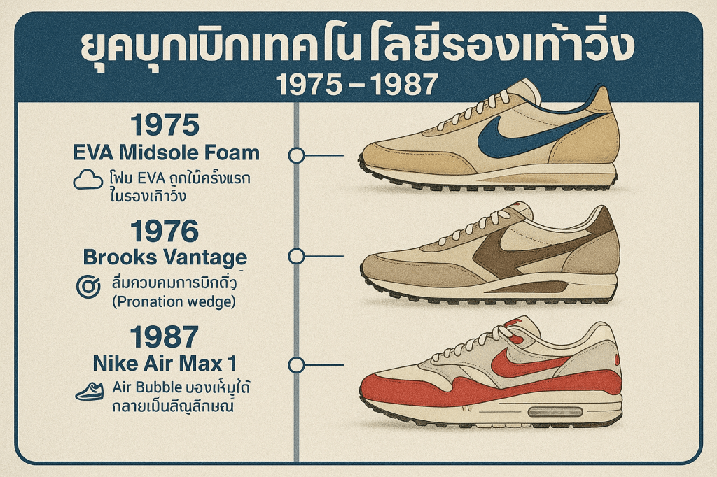หากย้อนกลับไปในช่วงต้นยุค 1970s รองเท้าวิ่งในสมัยนั้นมีเป้าหมายเพียงแค่การ “ปกป้องฝ่าเท้า” จากแรงกระแทกและพื้นผิวที่ไม่ราบเรียบ การออกแบบยังเรียบง่าย ไม่มีเทคโนโลยีเสริมแรง ไม่มีการวิเคราะห์ biomechanic ใด ๆ เลยด้วยซ้ำ
