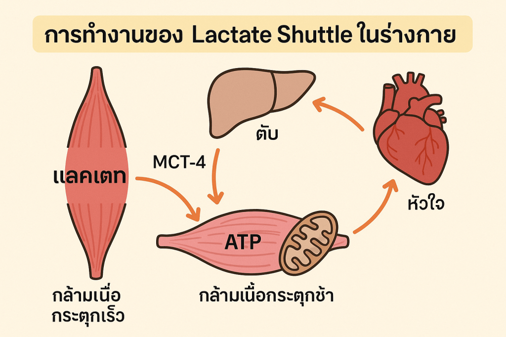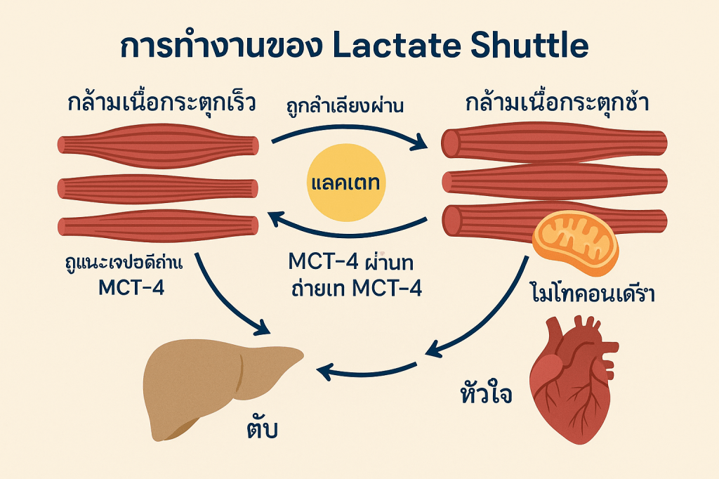 - กล้ามเนื้อ: ใยกล้ามเนื้อชนิด Fast-Twitch (Type II) ที่มีลักษณะ glycolytic สูง จะผลิตแลคเตทจำนวนมาก2 ซึ่งถูกขนส่งออกจากใยกล้ามเนื้อเหล่านี้โดย Monocarboxylate Transporter 4 (MCT-4)9 การกำจัดและการนำแลคเตทไปใช้ส่วนใหญ่เกิดขึ้นในใยกล้ามเนื้อชนิด Slow-Twitch (Type I) ซึ่งมี Monocarboxylate Transporter 1 (MCT-1) เพื่อนำแลคเตทเข้าสู่ภายใน9 แลคเตทจะถูกเปลี่ยนกลับเป็นไพรูเวทโดยเอนไซม์ mitochondrial lactate dehydrogenase (mLDH) และนำไปใช้สร้าง ATP ซึ่งเป็นการรีไซเคิลแลคเตทเป็นพลังงานที่ใช้งานได้9 การฝึกความทนทานช่วยเพิ่มกลไก “Lactate Shuttle” นี้ โดยปรับปรุงประสิทธิภาพและความอุดมสมบูรณ์ของ Transporter และเอนไซม์เหล่านี้9