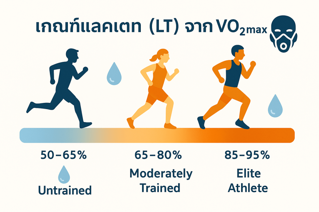 - เปอร์เซ็นต์ของ VO2 Max: Lactate Threshold สามารถประมาณได้เป็นเปอร์เซ็นต์ของการใช้ออกซิเจนสูงสุด (VO2 Max) ของบุคคล1 นักกีฬาระดับพักผ่อนโดยทั่วไปจะบรรลุ LT ระหว่าง 65% ถึง 80% ของ VO2 Max ในขณะที่นักกีฬาที่ได้รับการฝึกฝนมาอย่างดีและนักกีฬาชั้นนำสามารถผลักดันขีดจำกัดนี้ไปที่ 85% ถึง 95% ของ VO2 Max ได้1