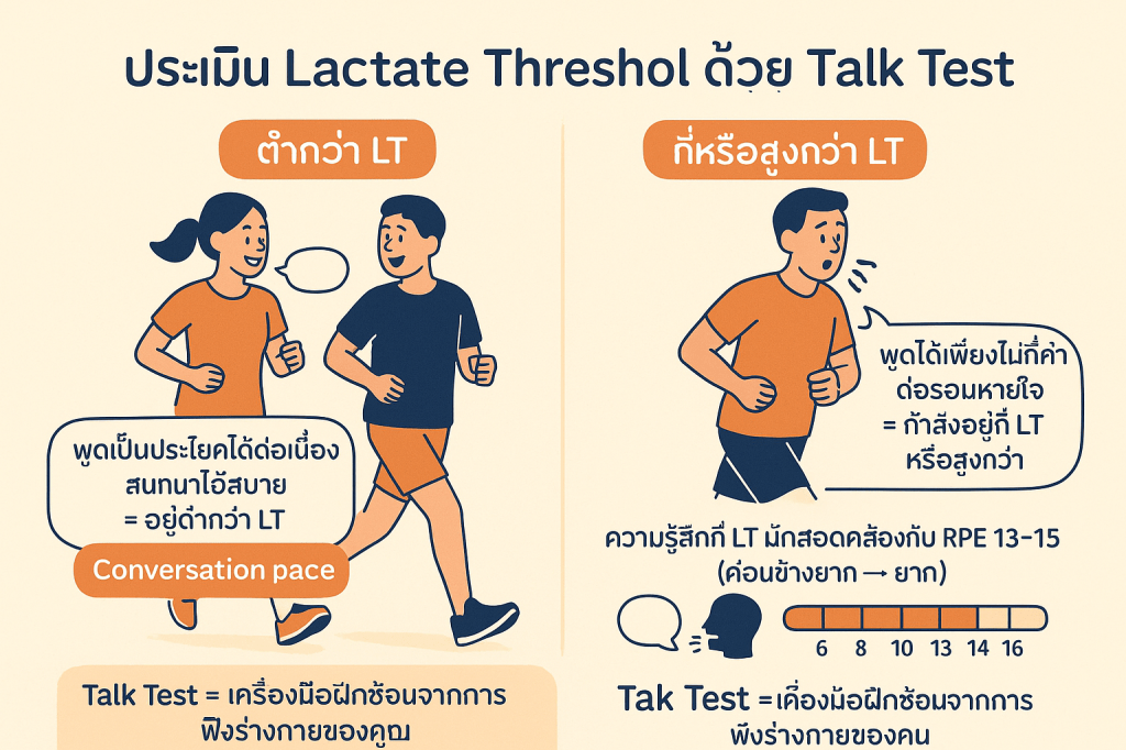 - Talk Test (การทดสอบการพูดคุย): วิธีนี้เป็นวิธีที่ง่าย ใช้ได้จริง และไม่รุกราน โดยอาศัยการรับรู้ความเหนื่อยล้า ความสามารถในการพูดคุยได้อย่างสบายๆ ระหว่างการออกกำลังกายบ่งชี้ว่านักวิ่งกำลังทำงานอยู่ต่ำกว่า Lactate Threshold20 ในทางกลับกัน หากการพูดประโยคเต็มๆ เป็นเรื่องยาก หรือนักวิ่งสามารถพูดได้เพียงไม่กี่คำในแต่ละครั้ง แสดงว่าพวกเขากำลังอยู่ที่หรือสูงกว่า Lactate Threshold20 วิธีนี้สอดคล้องกับอัตราการรับรู้ความเหนื่อยล้า (RPE) ที่ 13-15 ซึ่งสอดคล้องกับความพยายาม “ค่อนข้างยาก” ถึง “ยาก”11