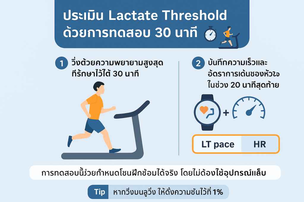 - การทดสอบ Time Trial 30 นาที: การทดสอบภาคสนามที่ใช้กันอย่างแพร่หลายเกี่ยวข้องกับการวิ่ง (หรือเดินเร็ว) ด้วยความพยายามสูงสุดที่ยั่งยืนเป็นเวลา 30 นาที ซึ่งมักจะทำบนลู่วิ่งไฟฟ้าที่ความชัน 1% ความเร็วเฉลี่ยและอัตราการเต้นของหัวใจที่บันทึกได้ในช่วง 20 นาทีสุดท้ายของการทดสอบนี้สามารถให้การประมาณค่าที่น่าเชื่อถือของ Pace และอัตราการเต้นของหัวใจของนักวิ่งที่ระดับ Lactate Threshold2