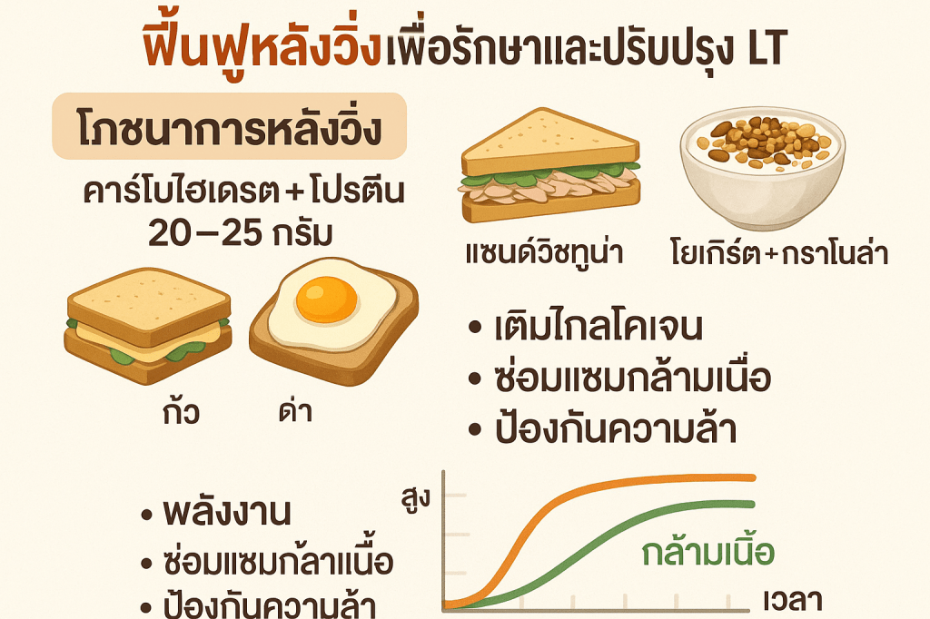 - โภชนาการหลังออกกำลังกาย: ทันทีหลังจากการฝึกที่เข้มข้น การแข่งขัน หรือการวิ่งระยะไกล การบริโภคคาร์โบไฮเดรตและโปรตีนร่วมกันมีความสำคัญอย่างยิ่ง กลยุทธ์นี้สนับสนุนการเติมไกลโคเจนในกล้ามเนื้ออย่างรวดเร็ว และช่วยในการซ่อมแซมและปรับตัวของกล้ามเนื้อ34 การดื่มน้ำที่เพียงพอเป็นสิ่งสำคัญอย่างยิ่งสำหรับการชดเชยน้ำและการสูญเสียเหงื่อ47