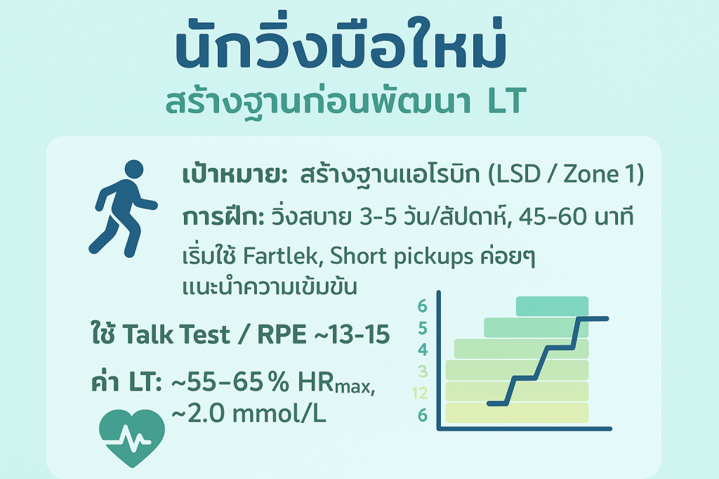 - นักวิ่งเริ่มต้น: เน้นการสร้างรากฐานความฟิตแบบแอโรบิกที่แข็งแกร่งผ่านการวิ่งที่ง่ายและสม่ำเสมอ21 การเพิ่มระยะทางหรือความเข้มข้นต้องค่อยเป็นค่อยไป21 อาจมีการแนะนำการวิ่งที่เร็วขึ้นในปริมาณเล็กน้อย เช่น Fartlek หรือการเร่งความเร็วสั้นๆ21 สำหรับนักวิ่งเริ่มต้น ค่า LT โดยทั่วไปจะอยู่ที่ 50-65% ของ VO2 max หรือประมาณ 55-65% ของอัตราการเต้นของหัวใจสูงสุด2
