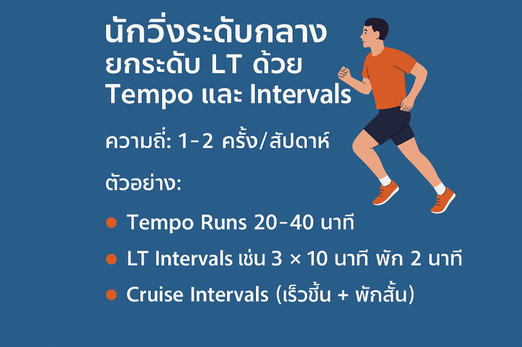 - นักวิ่งระดับปานกลาง: สามารถเพิ่มระยะเวลาของการวิ่ง Tempo (เช่น จาก 10 นาทีเป็น 20-30 นาที) และขยายจำนวนหรือความยาวของช่วง Lactate Threshold Intervals21 การวิ่ง Tempo และ Cruise Intervals กลายเป็นหัวใจสำคัญของการฝึกของพวกเขา23 สำหรับนักกีฬาระดับปานกลางหรือนักกีฬาสันทนาการ ค่า LT โดยทั่วไปจะอยู่ที่ 65-80% ของ VO2 max หรือประมาณ 80-90% ของอัตราการเต้นของหัวใจสูงสุด2