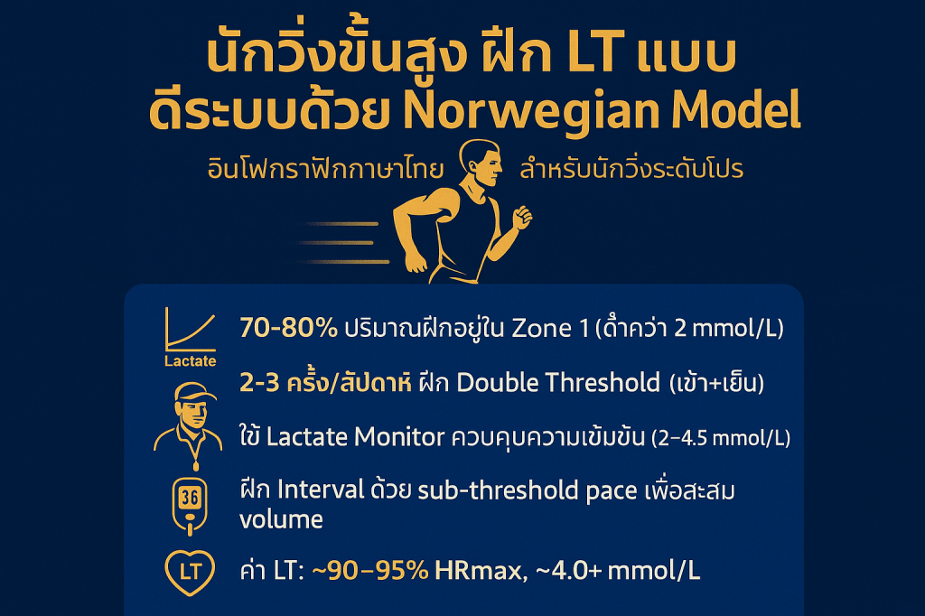 - The “Norwegian Model”: เป็นแนวทางการฝึก Threshold ที่ซับซ้อน ซึ่งเน้นปริมาณงานความเข้มข้นต่ำในปริมาณมากรวมกับการออกกำลังกายแบบ “Double-Threshold” โดยความเข้มข้นของการฝึกจะถูกกำหนดอย่างแม่นยำโดยการทดสอบแลคเตทในเลือด1 แง่มุมที่น่าสังเกตคือการฝึกที่ความเข้มข้นของแลคเตทที่ 2 ถึง 4.5 mmol/L โดยนักกีฬาบางคนตั้งเป้าหมายความเข้มข้นที่ “ต่ำกว่า” LT แบบดั้งเดิม (เช่น 2.5-3.5 mmol/L)23 เหตุผลเบื้องหลังกลยุทธ์นี้คือการสะสมปริมาณการฝึกที่มากขึ้นที่ความเข้มข้นที่ต่ำกว่าเล็กน้อยแต่ยังคงท้าทาย (มักเรียกกันว่า Sub-Threshold) ช่วยให้มีปริมาณการฝึกโดยรวมมากขึ้นโดยมีภาวะตึงเครียดของกล้ามเนื้อน้อยลงอย่างมีนัยสำคัญ แนวทางนี้เชื่อว่าจะส่งเสริมการปรับตัวที่มากขึ้นในใยกล้ามเนื้อชนิด Slow-Twitch และเพิ่มกลไกการกำจัดแลคเตท9