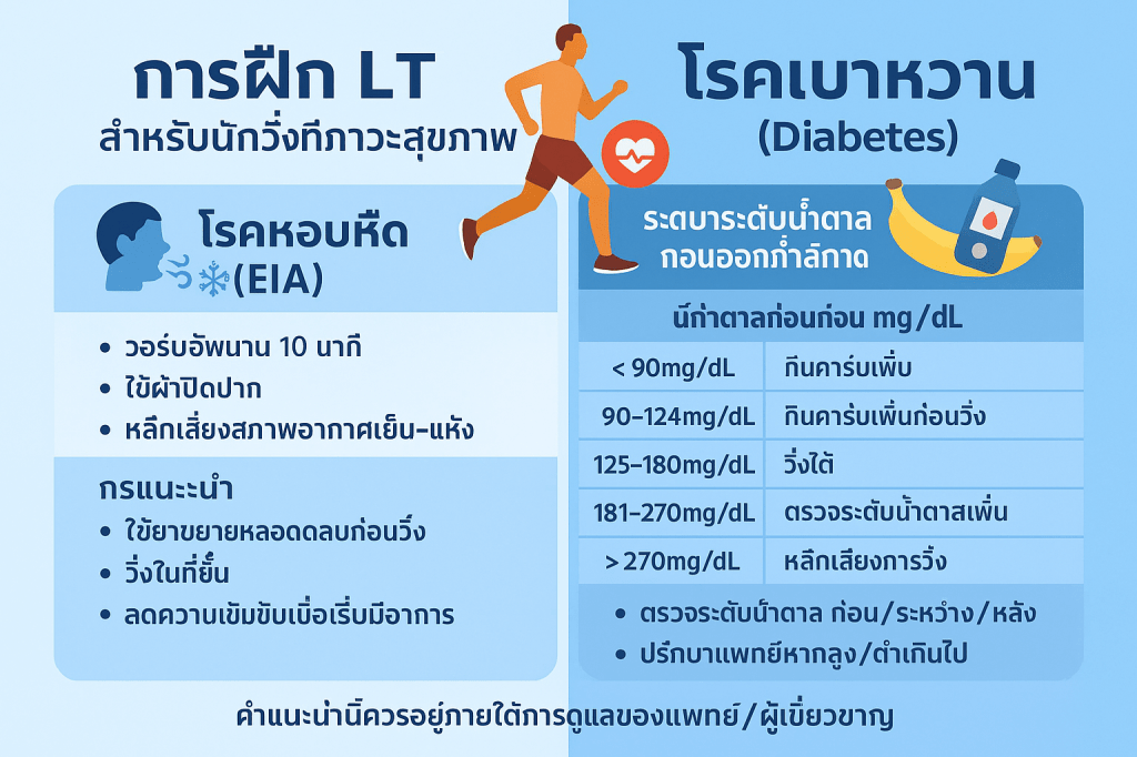 นักวิ่งที่มีภาวะสุขภาพที่มีอยู่ก่อนแล้วต้องพิจารณาอย่างรอบคอบและมักจะปรับเปลี่ยนโปรแกรมการฝึก Lactate Threshold เพื่อความปลอดภัยและประโยชน์สูงสุด