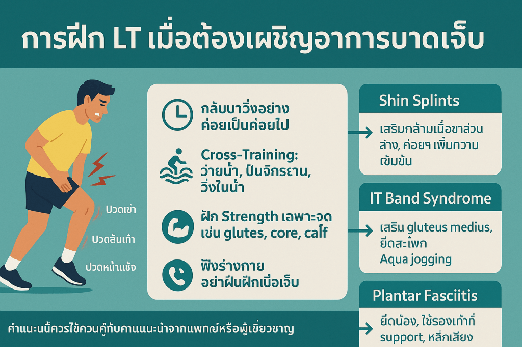 การบาดเจ็บมักเป็นกลไกข้อเสนอแนะที่สำคัญ ซึ่งบ่งชี้ถึงความไม่ตรงกันระหว่างภาระการฝึก/ความเข้มข้น และความสามารถทางโครงสร้างหรือชีวกลศาสตร์ของร่างกาย การแก้ไขการบาดเจ็บจึงต้องใช้มากกว่าการพักผ่อน แต่ยังต้องมีแนวทางเชิงรุกในการเสริมสร้างความแข็งแรงของกลุ่มกล้ามเนื้อเฉพาะ (เช่น กล้ามเนื้อขาส่วนล่างสำหรับ Shin Splints กล้ามเนื้อสะโพก abductor สำหรับ IT Band Syndrome) และการปรับปรุงรูปแบบการวิ่งเพื่อลดความเครียดที่ไม่จำเป็น แนวทางเชิงรุกและครอบคลุมนี้ไม่เพียงช่วยอำนวยความสะดวกในการฟื้นตัวเท่านั้น แต่ยังสร้างนักกีฬาที่มีความยืดหยุ่นมากขึ้นในระยะยาว ด้วยการเพิ่มความสมบูรณ์ของโครงสร้างและประสิทธิภาพทางชีวกลศาสตร์ นักวิ่งสามารถสนับสนุน Lactate Threshold ที่สูงขึ้นและยั่งยืนมากขึ้นโดยปริยาย โดยลดการหยุดชะงักของการฝึกอย่างสม่ำเสมอในอนาคต การเปลี่ยนแปลงจากการจัดการการบาดเจ็บแบบปฏิกิริยาไปสู่การป้องกันเชิงรุกและการพัฒนาแบบองค์รวมเป็นกุญแจสำคัญสำหรับประสิทธิภาพที่ยั่งยืน