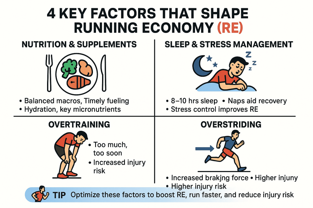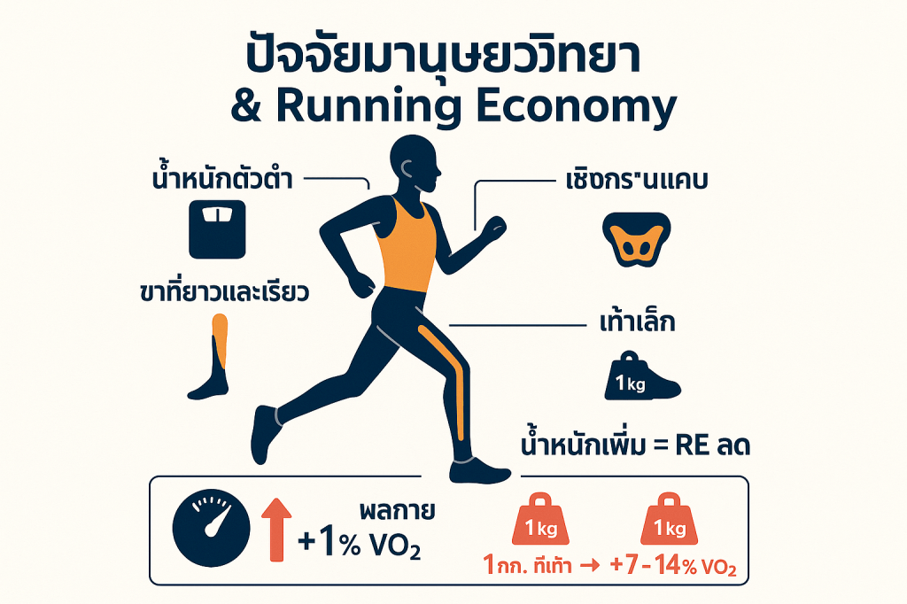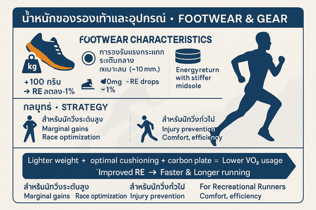 - รองเท้าและอุปกรณ์: รองเท้าที่มีน้ำหนักเบาและมีเทคโนโลยีที่เหมาะสมสามารถปรับปรุง RE ได้ (“Modern racing shoes with carbon plates or high-energy foam can improve economy ~2–4% for many runners.”)