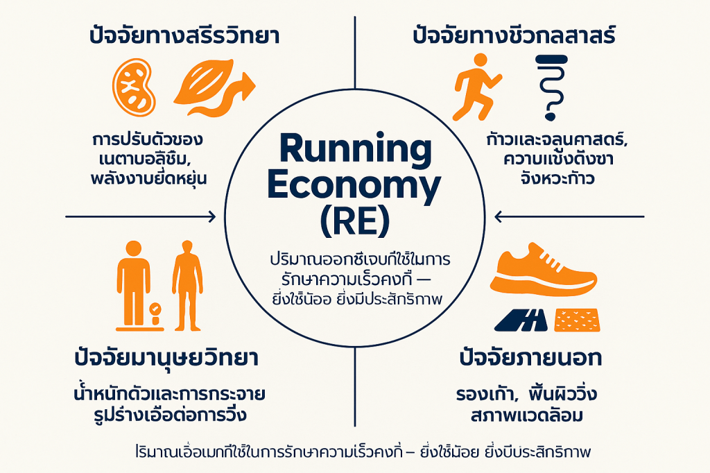 - การเปรียบเทียบ: เปรียบได้กับ “ประสิทธิภาพการใช้น้ำมันของรถยนต์” (“The concept of running economy can be likened to the fuel efficiency of a vehicle.”) การปรับปรุง RE ช่วยให้นักวิ่งสามารถรักษาระยะความเร็วที่กำหนดได้นานขึ้น หรือวิ่งได้เร็วขึ้นโดยใช้ปริมาณออกซิเจนเท่าเดิม ช่วยลดความเหนื่อยล้าและเพิ่มความทนทาน