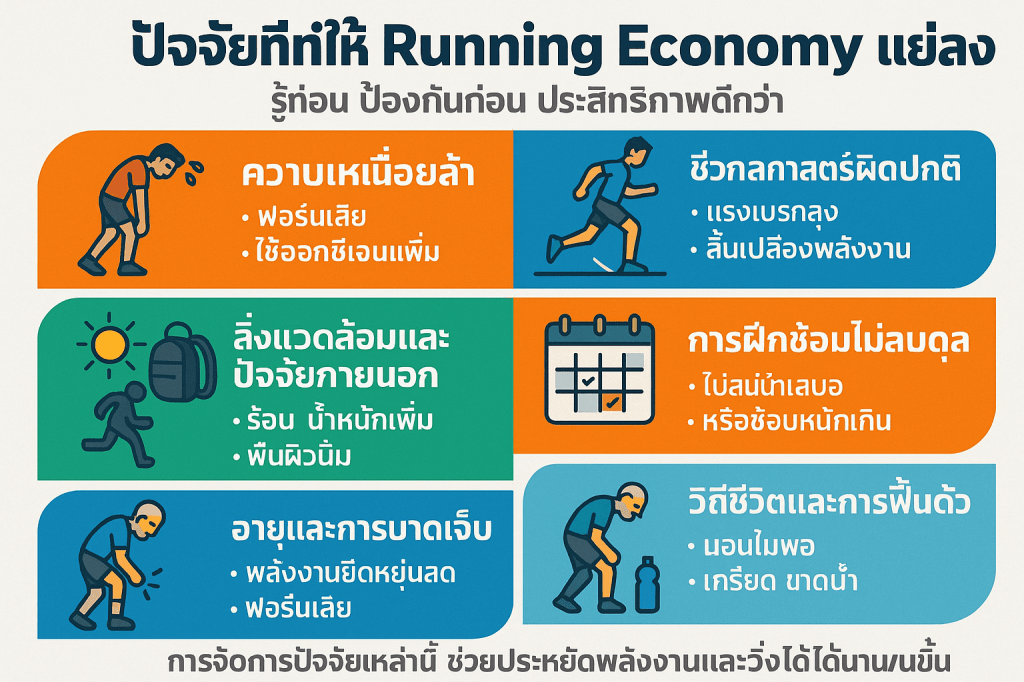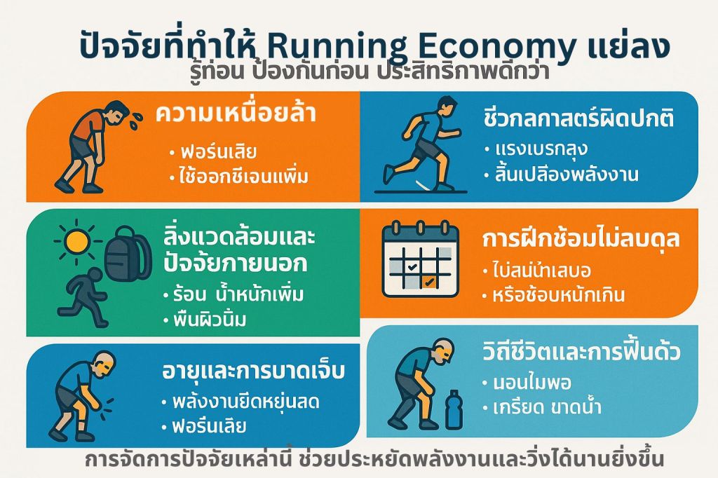 - ชีวกลศาสตร์ที่ไม่เหมาะสม: การลงเท้าที่เบรกแรง (deceleration) หรือการก้าวเลยจุดศูนย์ถ่วงของร่างกาย (overstriding) จะลดประสิทธิภาพลงอย่างมาก (“Decreasing speed during ground contact (deceleration), which is the least economical factor regardless of contact time.”)