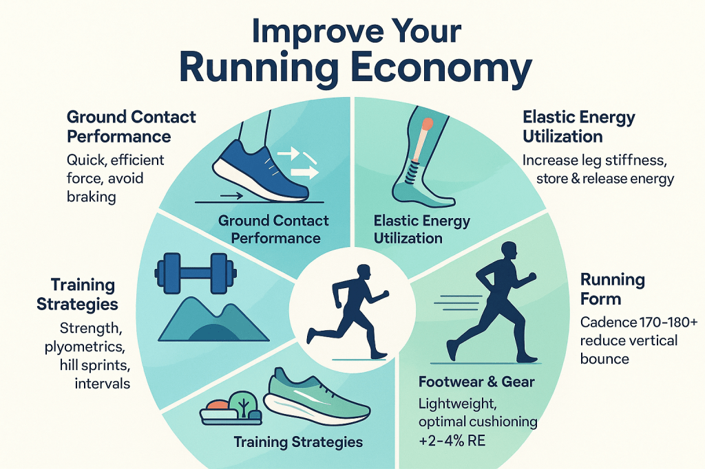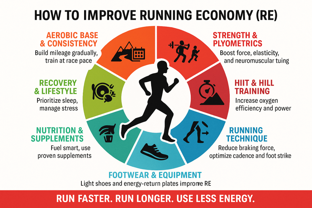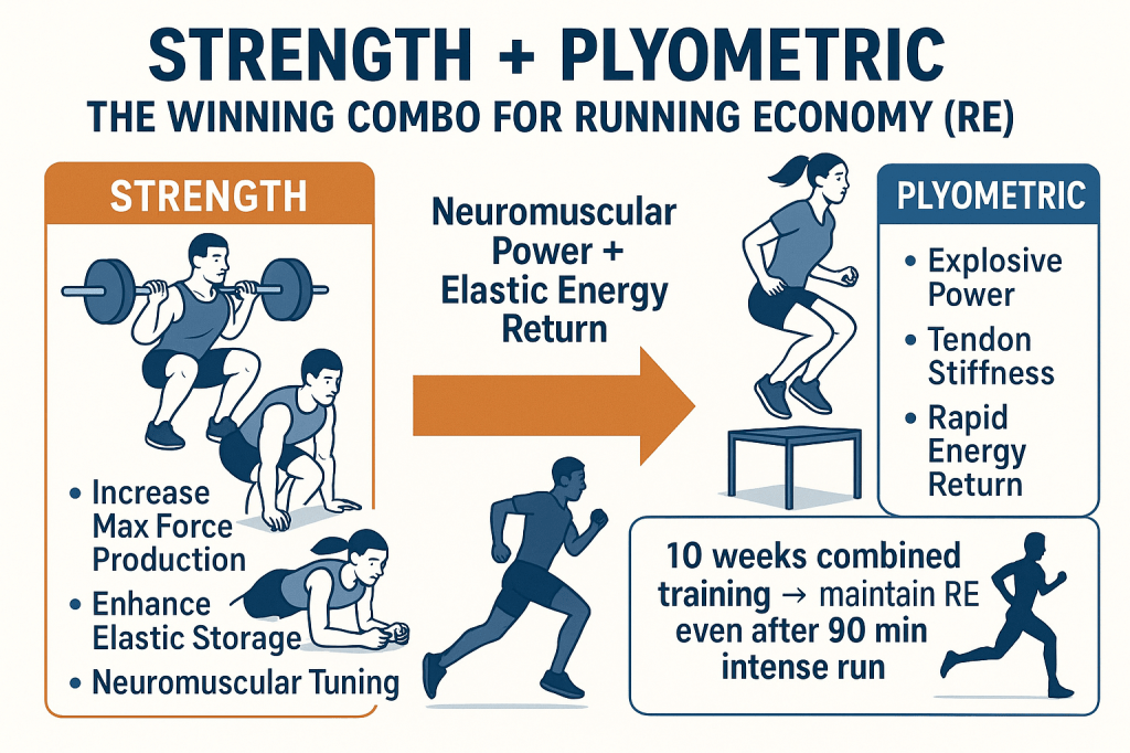 - การฝึกความแข็งแรงและ Plyometrics: การฝึกความแข็งแรงโดยใช้น้ำหนักมาก (เช่น squat, deadlift) และการออกกำลังกายแบบ plyometrics (เช่น กระโดด) เป็นวิธีที่มีประสิทธิภาพที่สุดวิธีหนึ่งในการปรับปรุง RE ซึ่งช่วยเพิ่มการใช้พลังงานยืดหยุ่นและการคืนพลังงาน (“Twice-weekly resistance training is one of the most effective methods to improve RE. … Plyometric exercises (jumps, bounds, medicine-ball throws) enhance tendon stiffness and explosive power, which improves elastic energy return during running.”) มีรายงานว่าการฝึกความแข็งแรง/กำลังสามารถปรับปรุง RE ได้ 5-8%