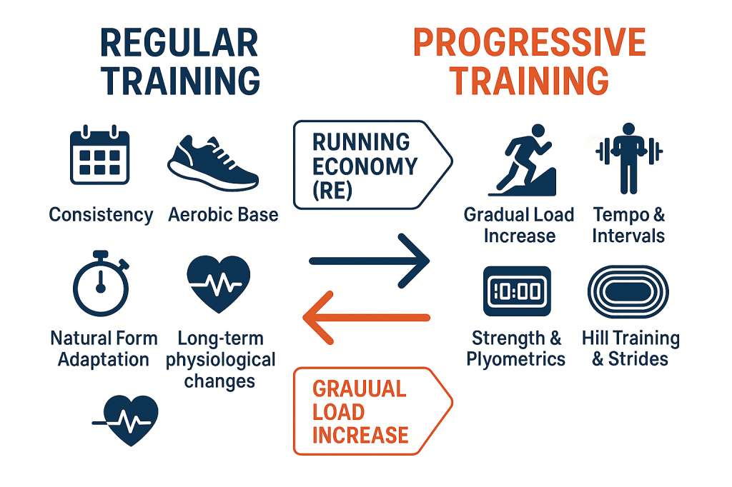 - สร้างฐานแอโรบิก: การเพิ่มระยะทางและระยะเวลาการฝึกฝนอย่างสม่ำเสมอจะช่วยปรับปรุง RE ตามธรรมชาติ (“Increasing mileage and years of training naturally improves economy.”)