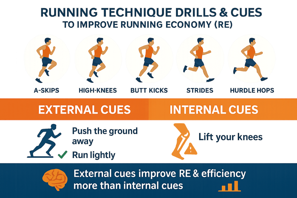 - การฝึกเทคนิคการวิ่ง: การฝึกซ้อม (drills) เช่น A-skips, high-knees ช่วยเสริมสร้างฟอร์มที่ดี (“Drills like A-skips, high-knees, butt kicks, strides and hurdle hops reinforce good form (upright posture, hip extension, quick leg turnover) without the speed and fatigue of full runs.”) คิวภายนอก (external cues) เช่น “ผลักพื้นไปข้างหลัง” มีประสิทธิภาพมากกว่าคิวภายใน (internal cues)