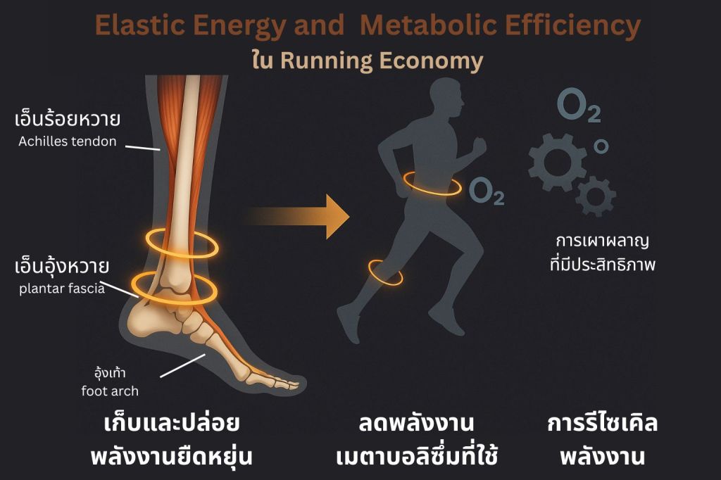 - การประสานงานและคุณสมบัติของกล้ามเนื้อ-เอ็น: นักวิ่งที่มีประสิทธิภาพจะใช้การหดตัวและคลายตัวของกล้ามเนื้ออย่างราบรื่น และใช้ประโยชน์จากการเด้งกลับของเอ็น (เช่น เอ็นร้อยหวาย) เพื่อรีไซเคิลพลังงาน (“Efficient runners “recruit” muscle fibers smoothly and exploit elastic recoil (Achilles tendon, foot arch) to recycle energy.”)