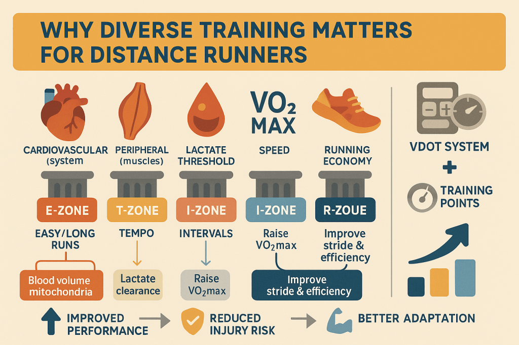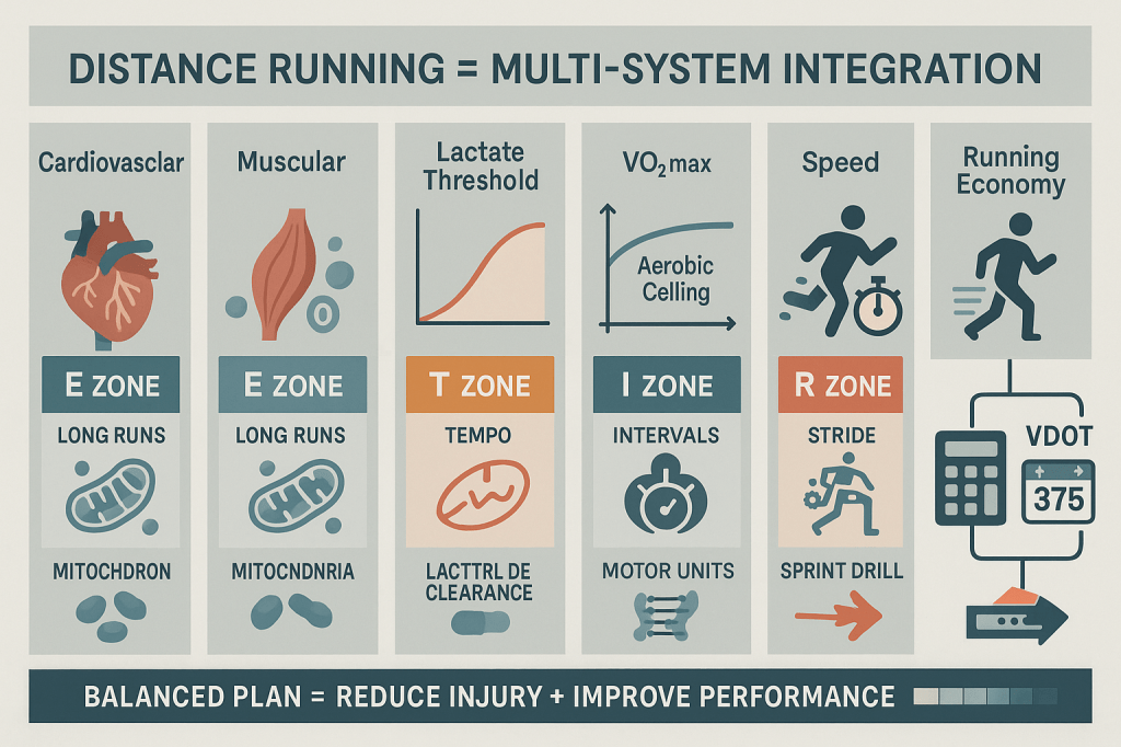 - ฝึกแยกแต่ละ “ระบบ” ด้วยจุดประสงค์เฉพาะ: E สำหรับ Cardio & Peripheral, T สำหรับ Lactate Threshold, I สำหรับ VO₂max, R สำหรับ Speed/Economy