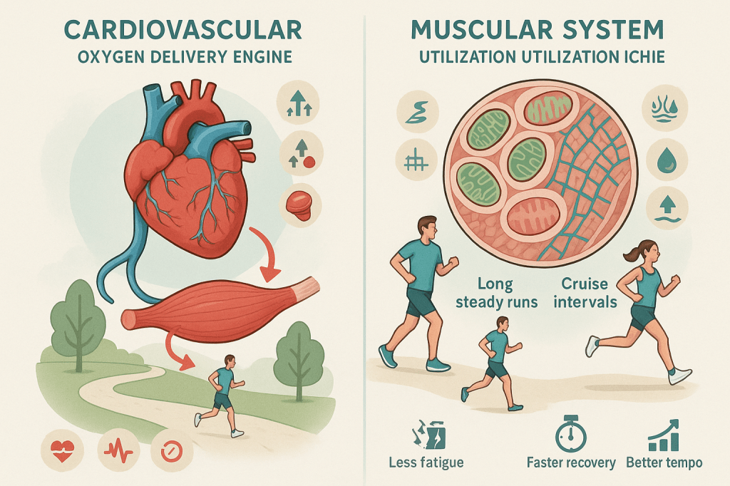 ◦ กลไกสรีรวิทยา: ต้องมีการปรับปรุงทั้งการส่งออกซิเจน (ผ่านหัวใจและเลือด) และการประมวลผลของกล้ามเนื้อ (ผ่านไมโตคอนเดรียและหลอดเลือดฝอย).
