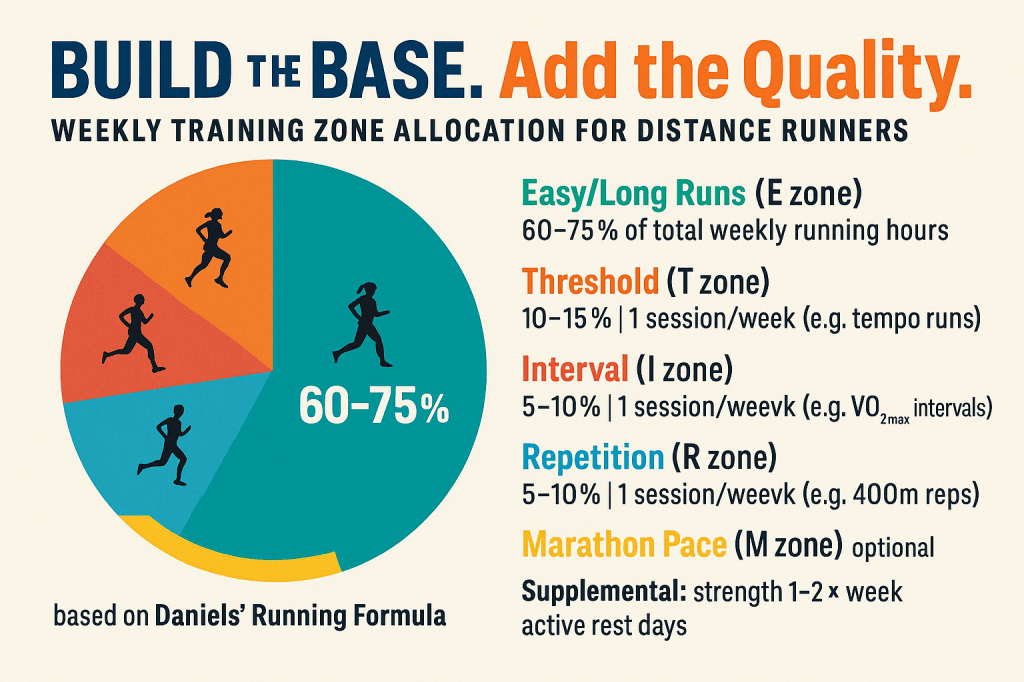 • โซนการฝึกซ้อม (Training Zones): Daniels ได้แบ่งโซนการฝึกออกเป็น 5 โซนหลัก ได้แก่ E (Easy), M (Marathon-pace), T (Threshold), I (Interval for VO₂max), และ R (Reps/Speed). แต่ละโซนมีวัตถุประสงค์ที่ชัดเจนในการกระตุ้นและพัฒนาองค์ประกอบสรีรวิทยาเฉพาะ. สิ่งสำคัญคือต้องเข้าใจและฝึกในแต่ละโซนตามวัตถุประสงค์ เพื่อให้ได้ผลลัพธ์ที่ดีที่สุดและลดความเสี่ยงจากการบาดเจ็บ.