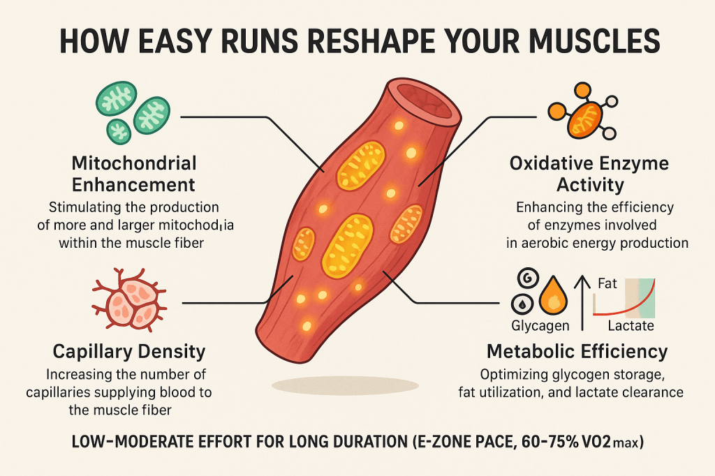 ◦ การฝึก: Easy runs & Long runs กระตุ้นการปรับตัวเหล่านี้ได้ดีที่สุด โดยเน้นที่ “เวลายาว” ในการฝึก. อาจเสริมด้วย tempo interval ที่ไม่หนักเกินไปเพื่อเร่งการปรับตัวทางเมตาบอลิซึมในกล้ามเนื้อ.