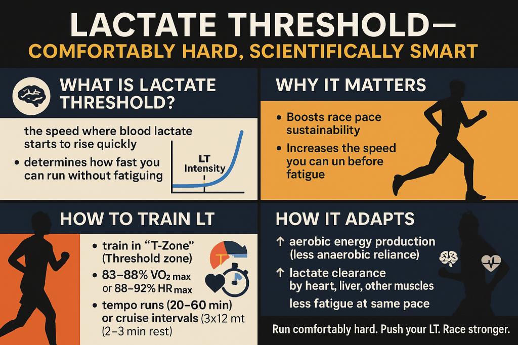 ◦ วัตถุประสงค์การพัฒนา: เพื่อให้ร่างกายสามารถวิ่งใกล้เคียงกับ VO₂max ได้โดยไม่เพิ่มระดับแลคเตทสูงเกินไป. เพิ่มความเร็วที่สามารถรักษาระดับแลคเตทให้คงที่ได้นานขึ้น (ประมาณ 20-60 นาที).