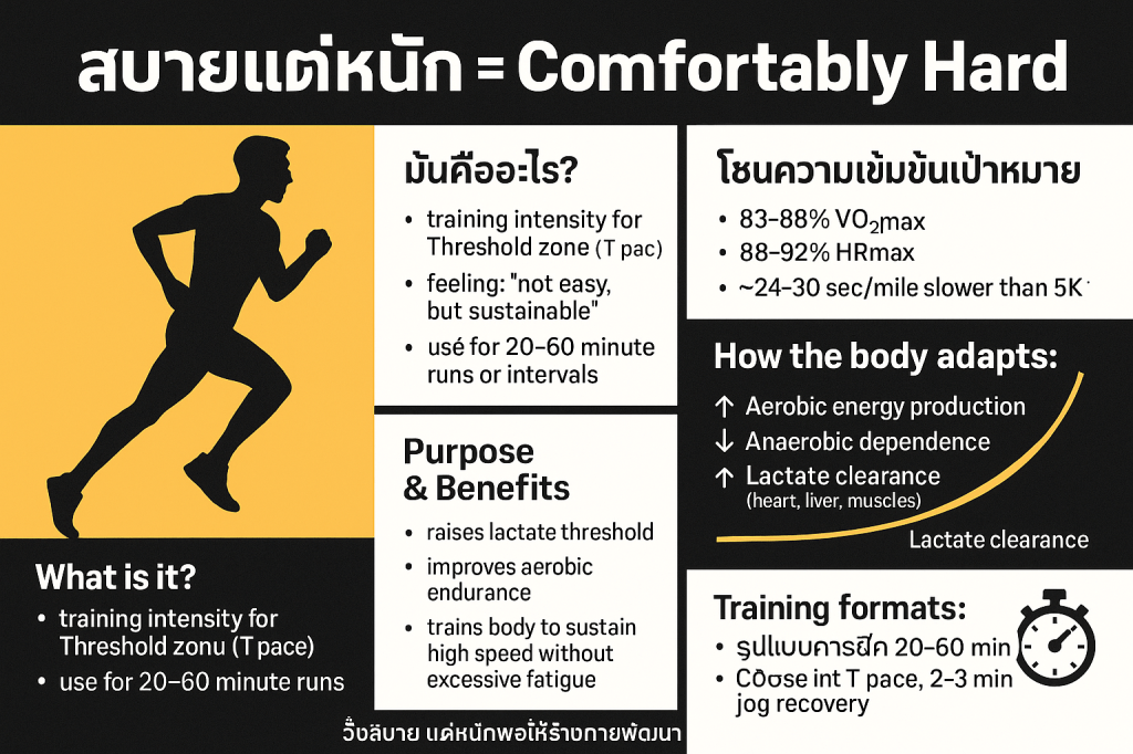 - ลักษณะการฝึก: tempo run 20–40 นาที หรือ cruise intervals เช่น 3×12 นาที พัก 2–3 นาที