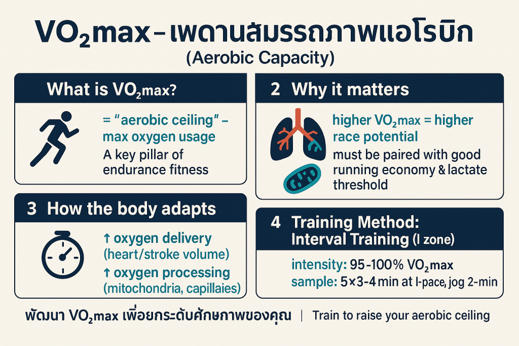 ◦ ทำไมสำคัญ: เป็นเพดานของการใช้พลังงานแบบแอโรบิกของร่างกาย. VO₂max ที่สูงขึ้นหมายถึงศักยภาพที่จะวิ่งได้เร็วขึ้น แต่ต้องประกอบกับ economy และ threshold ที่ดีด้วย.