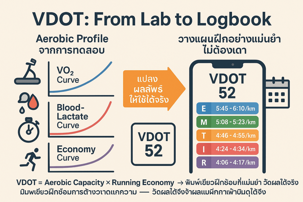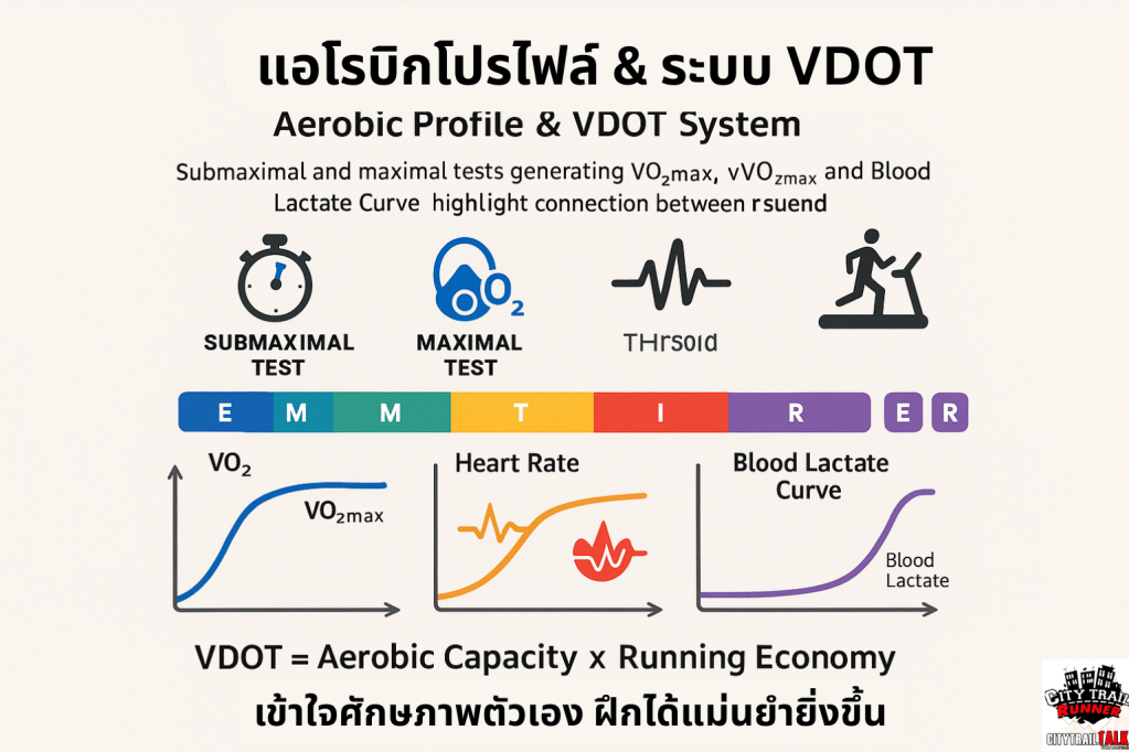 Aerobic Profile และระบบ VDOT เป็นเครื่องมือสำคัญที่เชื่อมโยงวิทยาศาสตร์การกีฬาเข้ากับสนามฝึกจริง ช่วยให้นักวิ่งวางแผนฝึกซ้อมอย่างแม่นยำและมีจุดหมาย พร้อมพัฒนาองค์ประกอบทางสรีรวิทยาได้ครบถ้วน ทั้งระบบหัวใจ กล้ามเนื้อ Threshold, VO₂max, Speed และ Running Economy — เพื่อความก้าวหน้าและความยั่งยืนในทุกก้าวของนักวิ่งระยะไกล