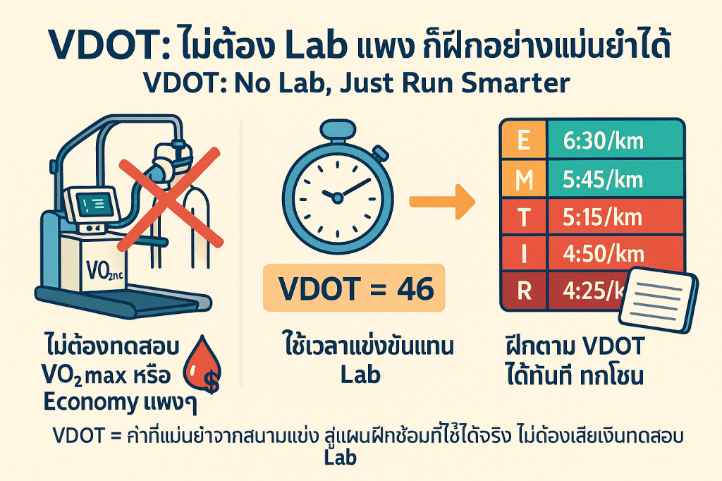 ระบบ VDOT คือค่า Aerobic Capacity ที่ได้จาก ผลการแข่งขันจริงหรือ Time Trial โดยไม่ต้องพึ่งห้องแล็บ ช่วยให้นักวิ่งสามารถ: